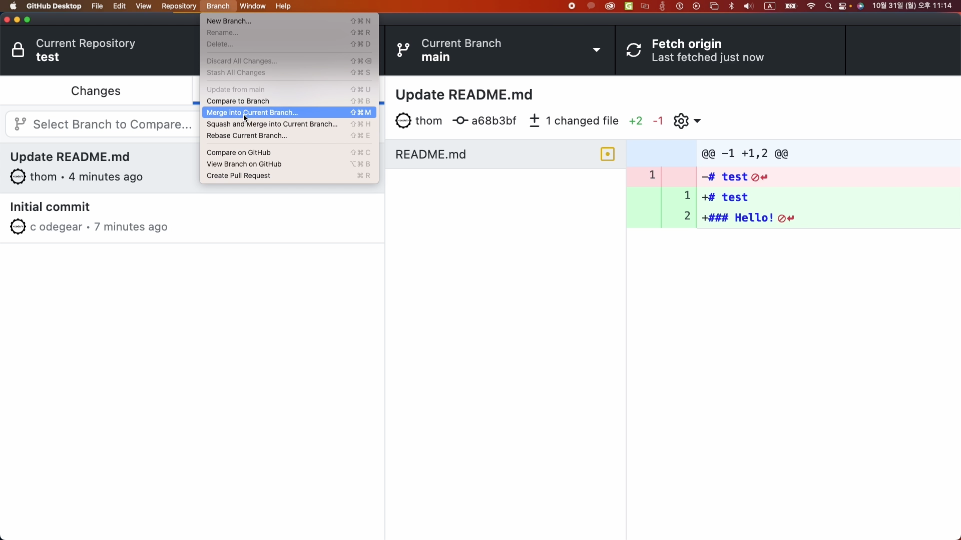 - 상단 메뉴에서 "Branch"-"Merge Into Current Branch"를 선택합니다.