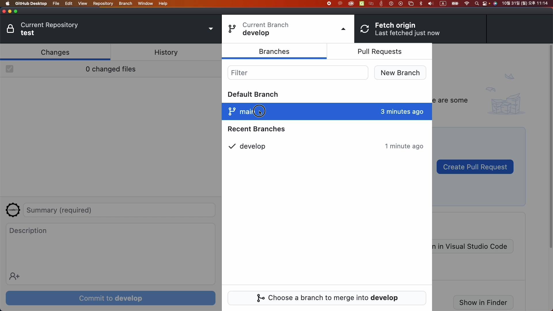 develop branch의 소스를 변경한 후 main에 merge 하는 방법입니다.
