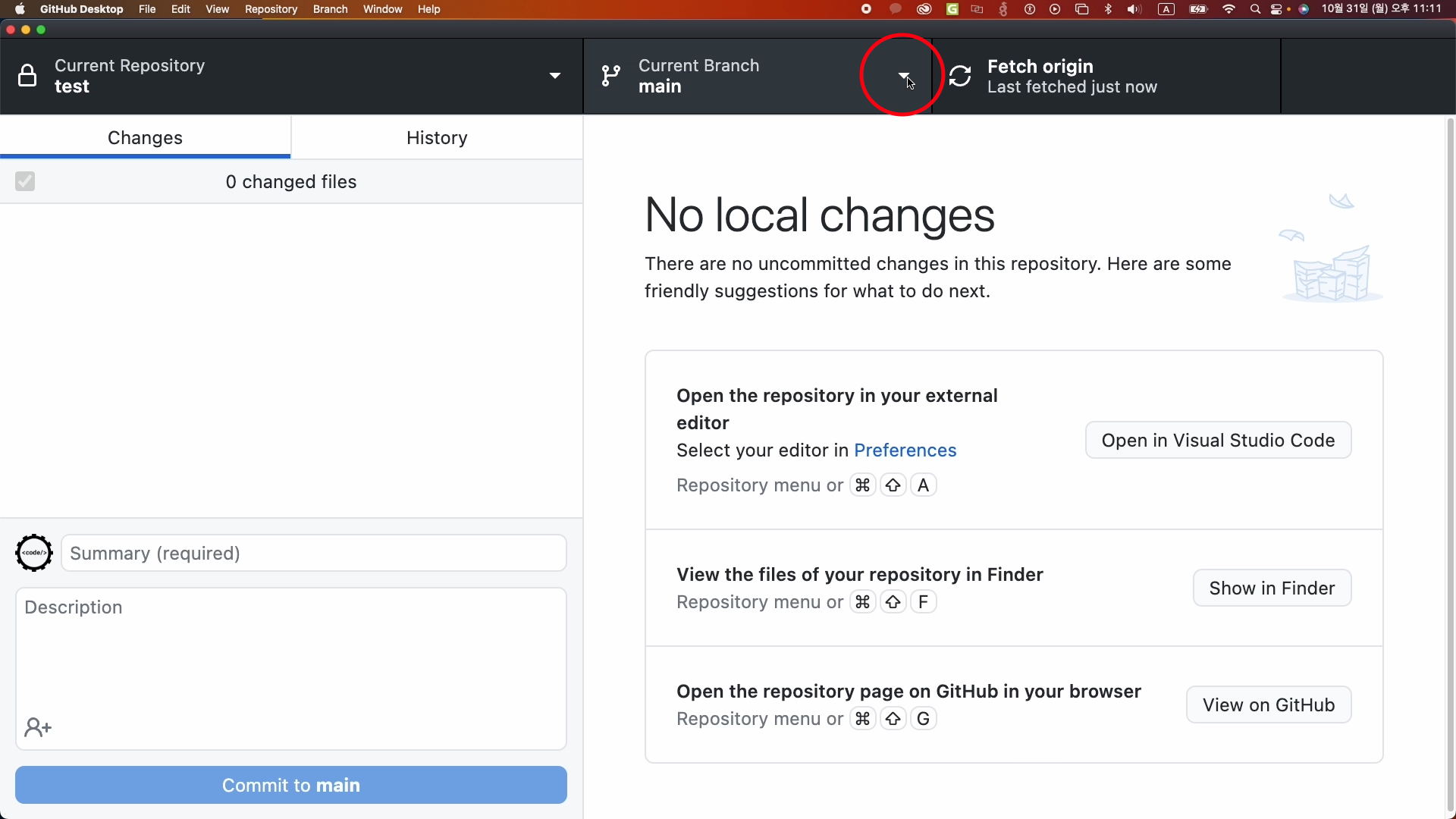 - 화면에서 main branch 옆의 화살표를 클릭합니다.