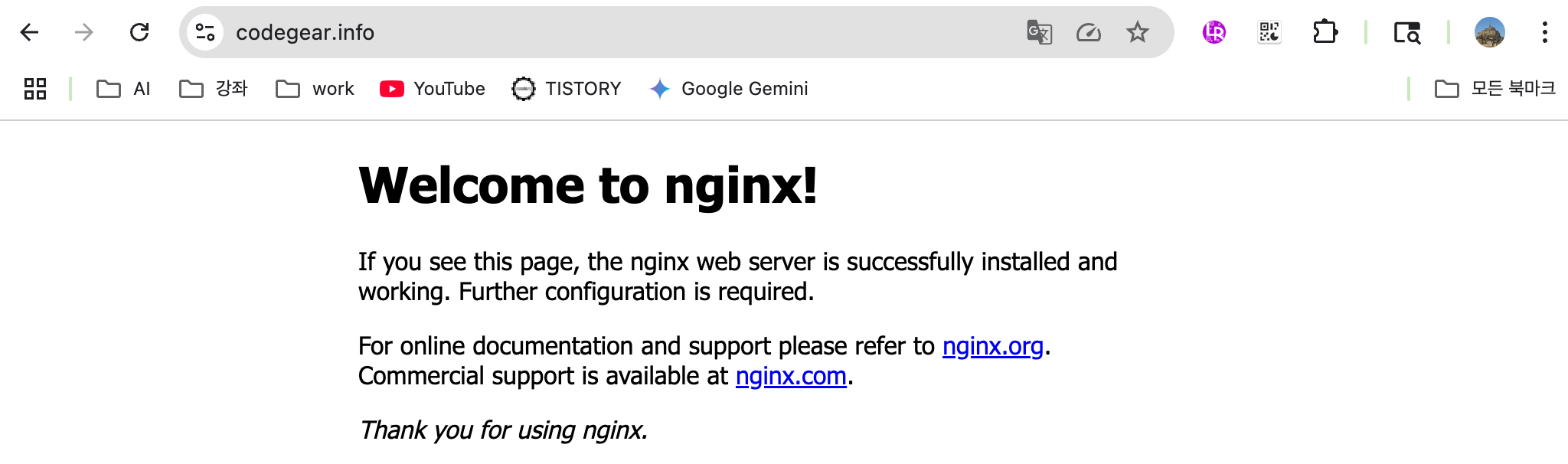 정상적으로 설치되었다면 Nginx의 기본 환영 페이지가 표시될 것입니다.