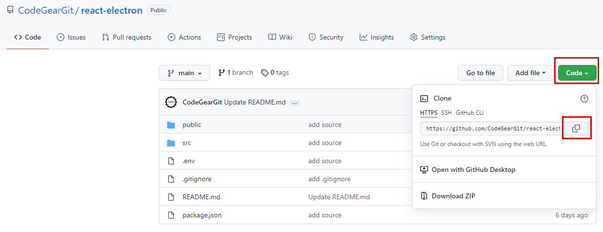 - github 사이트의 repository에서 react-electron의 code를 클릭하여 URL을 Copy합니다.