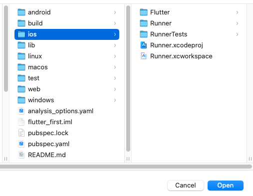 - 탐색 창에서 flutter_first 프로젝트 아래 있는 ios를 선택하면 됩니다.