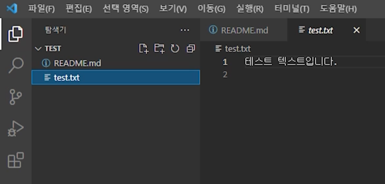 VSCode를 열면 새로 추가된 test.txt 파일을 확인할 수 있습니다.