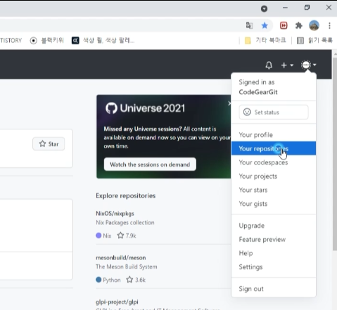회원 로그인 후 Repository를 만들기 위해 Your repositories로 이동합니다.