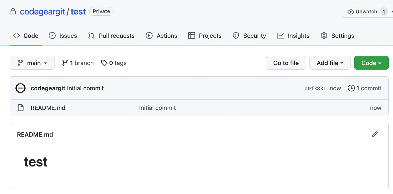 - readme 파일이 하나 추가된 [test repository]가 아래와 같이 생성됩니다.