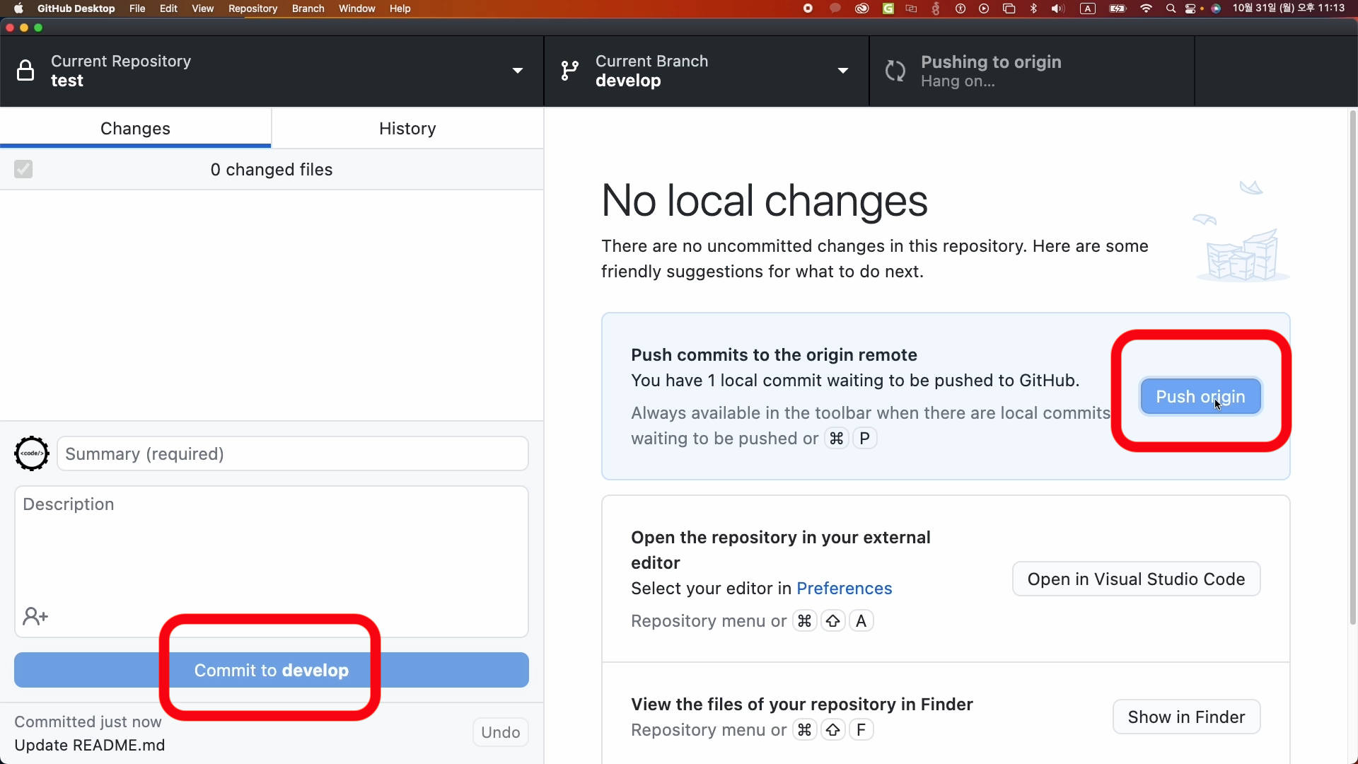 - develop branch에 commit과 push를 합니다.