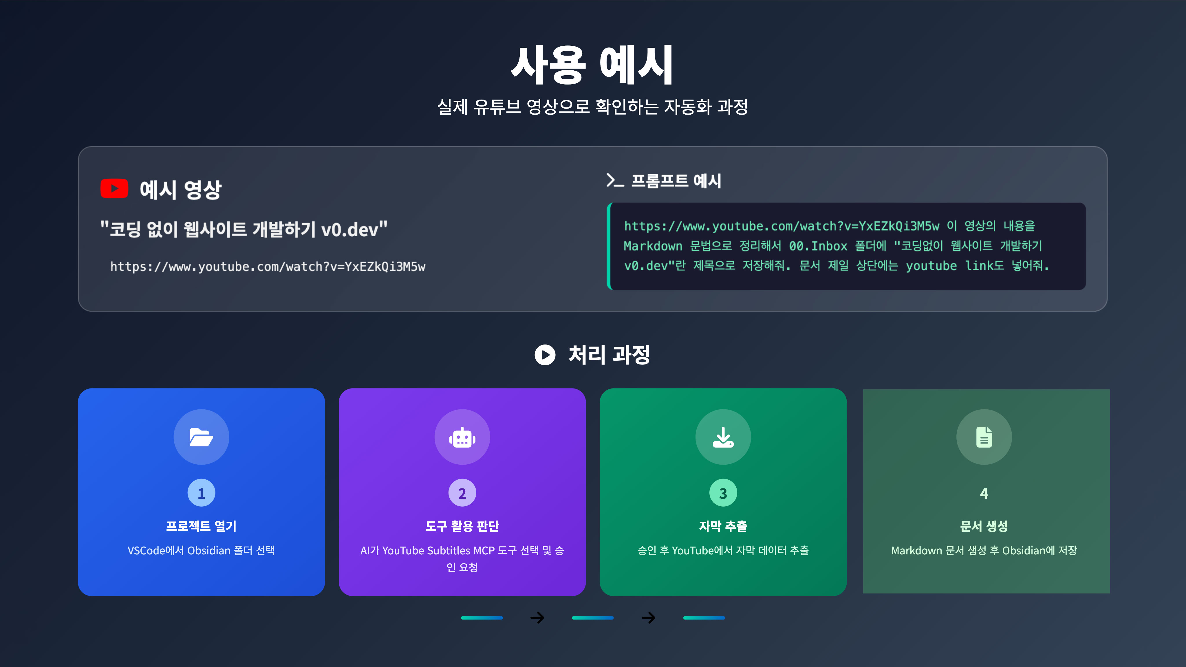 - 문서 생성: 마지막으로 AI가 내용을 정리하여 Markdown 문서를 생성하고 Obsidian에 저장합니다.