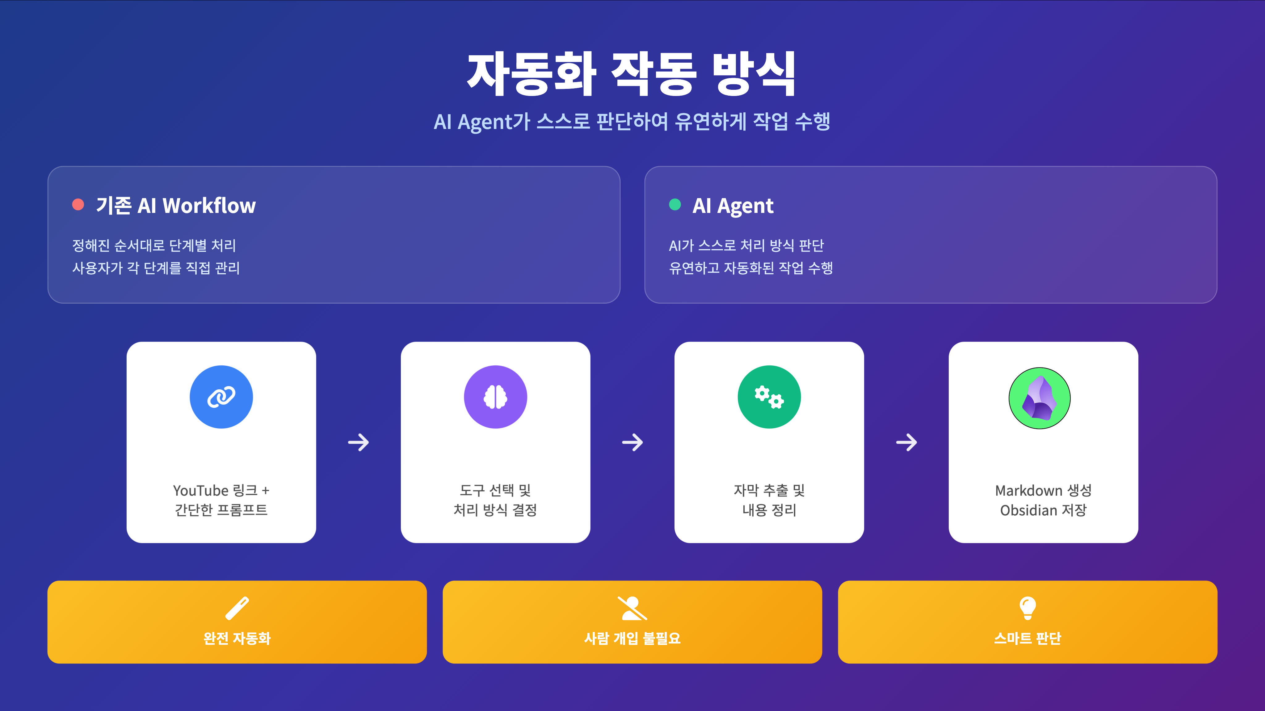 * 자동 처리: 유튜브 링크와 간단한 프롬프트만 입력하면, AI Agent가 모든 과정을 자동으로 처리합니다.