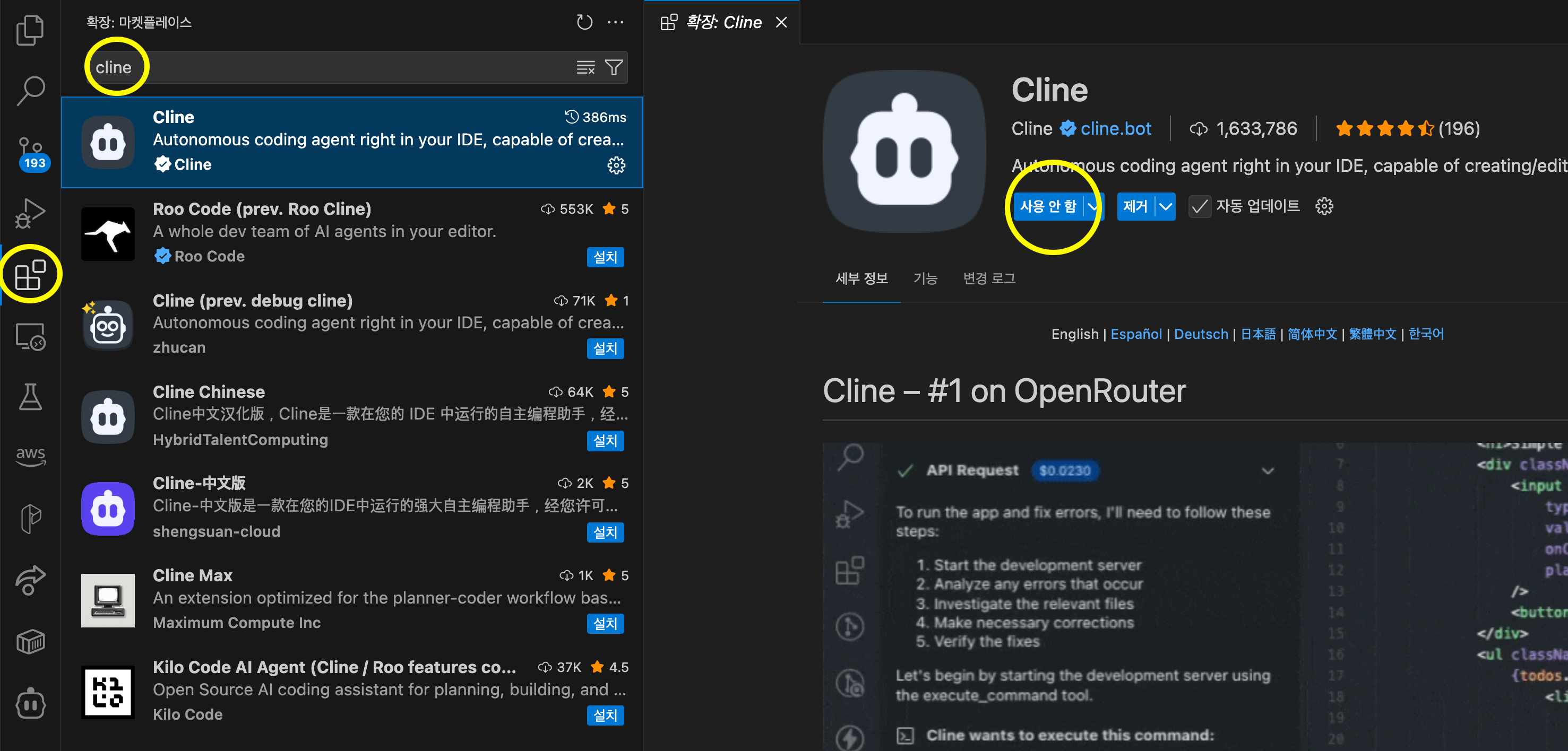 - Cline: Visual Studio Code의 확장 프로그램으로, 플러그인으로 쉽게 설치할 수 있습니다.