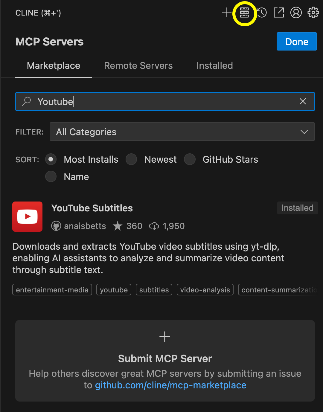 - YouTube Subtitles MCP 설치: 유튜브 스크립트를 가져오기 위해 MCP에서 YouTube Subtitles 도구를 설치합니다.