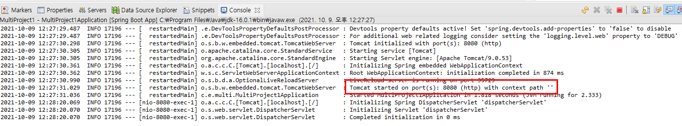 - Tomcat이 8080 포트로 Start 된 것을 확인할 수 있습니다.