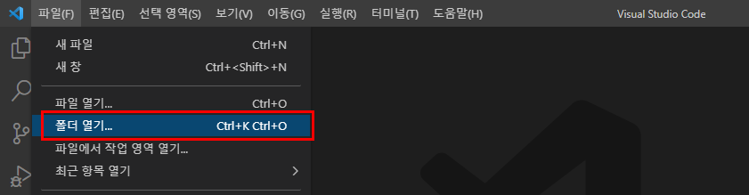 - VSCode를 실행하고 메뉴-폴더열기에서 프로젝트 폴더를 선택합니다.
