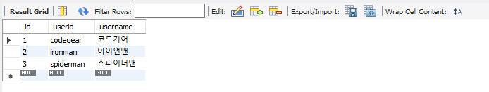 insert into test.user(userid, username) values ('ironman', '아이언맨');
