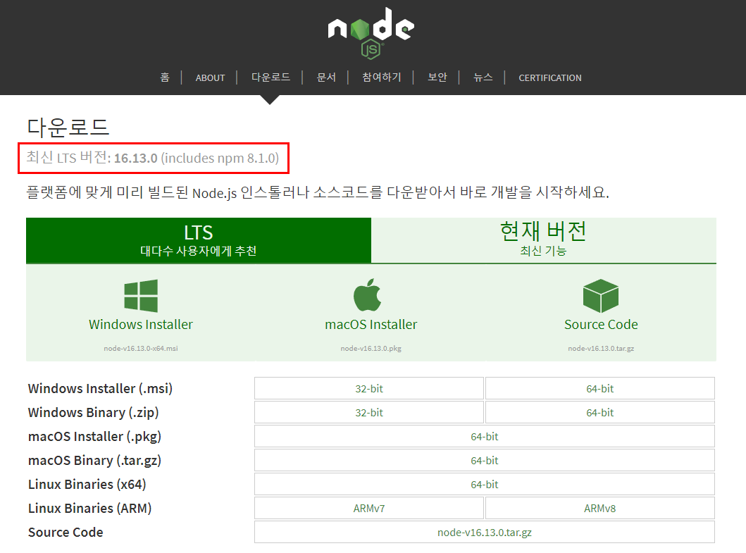 - LTS와 현재버전 둘 중에 하나를 선택하여 다운로드 받을 수 있습니다.