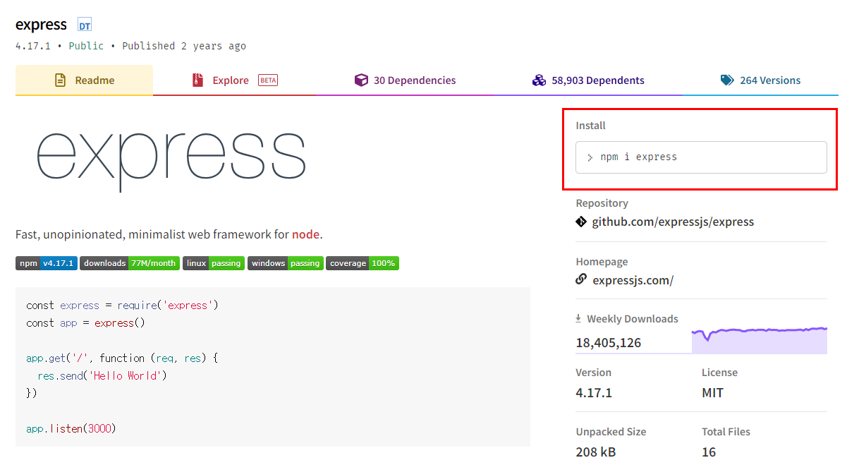 다음은 npmjs.com에서 nodejs의 서버 개발을 쉽게 해주는 express를 검색한 내용입니다.