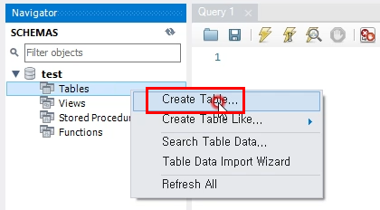 - test schema 아래 Tables에서 마우스 오른쪽버튼을 클릭한 후 "Create Table"을 클릭합니다.