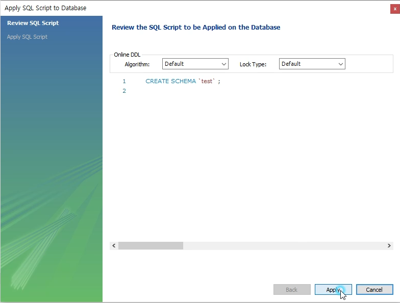 Create Schema Info - 생성될 Schema의 review 화면이 나오면 확인 후 Apply 버튼을 클릭합니다.