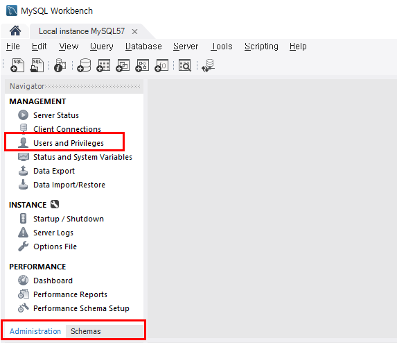 - 좌측 메뉴 중 Administration tab에서 "Users and Privileges"를 선택합니다.