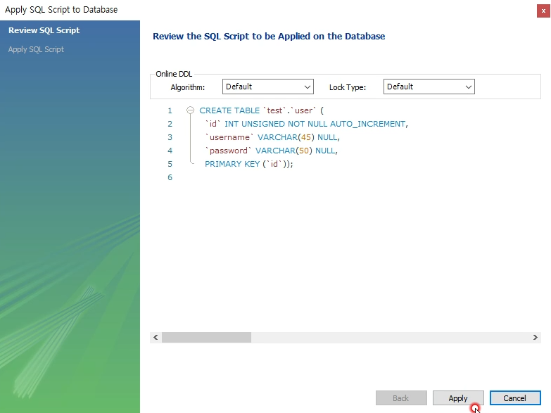 - Table script를 확인 후 Apply 버튼을 클릭합니다.