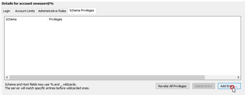 Input Login Name & Password - Schema Privileges에서 Add Entry를 클릭합니다.