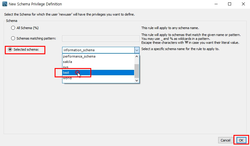 Click Add Entry - 앞에 생성한 test Schema에만 권한을 주기 위해 "Selected Schema"를 선택하고, 목록 중 "test"를 선택합니다.