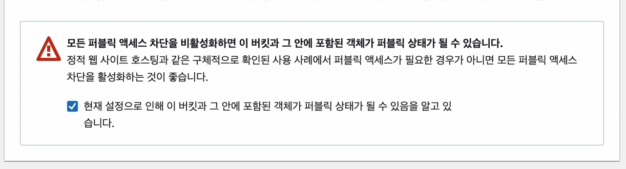 • "모든 퍼블릭 액세스 차단을 비활성화하면..." 아래의 체크박스를 체크.