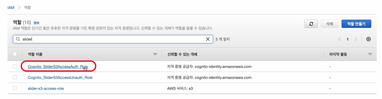 • 생성된 Role을 클릭.(예 : Cognito_SliderS3AccessAuth_Role)