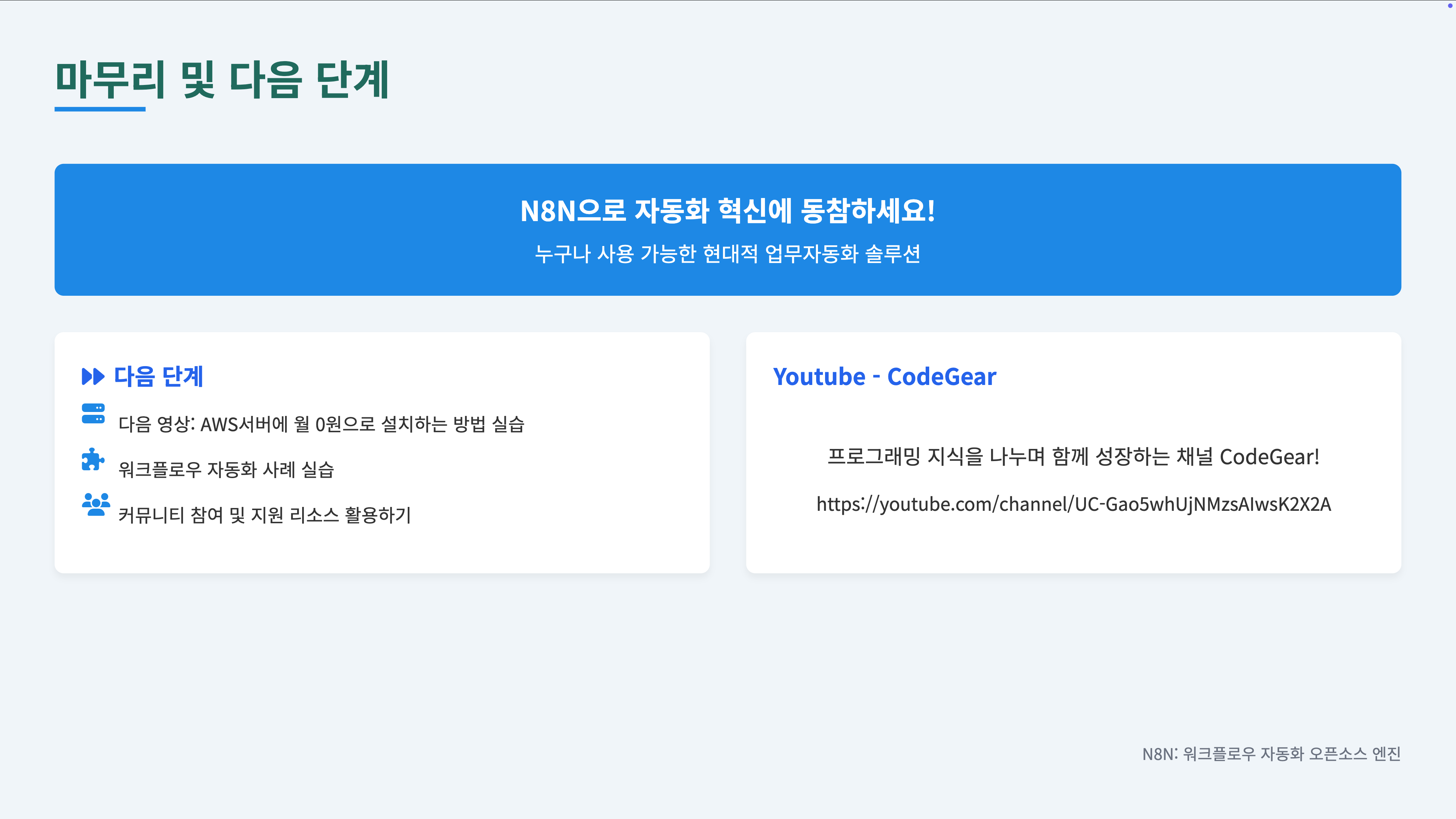 - 웹 브라우저를 열고 https://agent.codegear.info로 접속하여 N8N 웹 UI가 정상적으로 로드되는지 확인합니다.